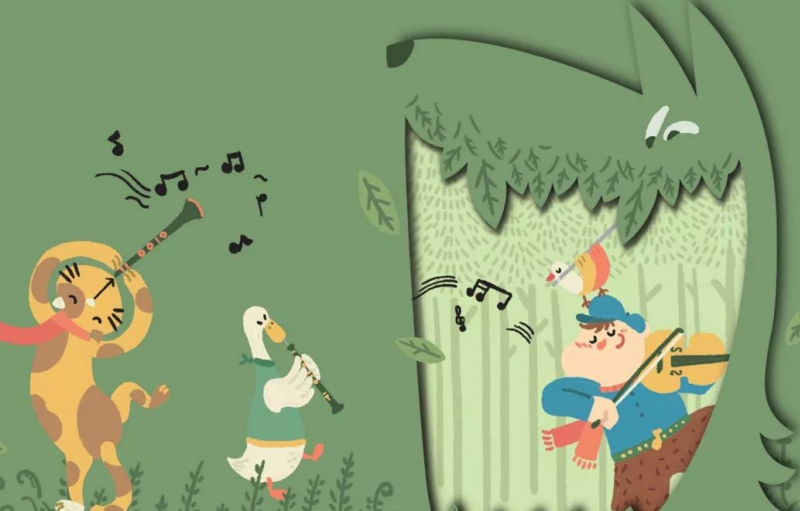 大灰狼是凶殘可惡的,表達它的音樂是用三只圓號吹奏出來的,從音色、音量和音調上,都有一種陰暗的感覺。媽咪和寶寶會感覺到這是反面形象的音樂。