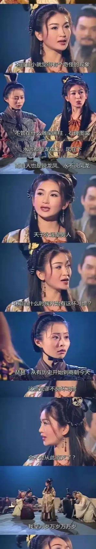 後面妲己在自己的君臣面前還貢獻了十分經典的對話:“本宮自小就覺得有個奇怪的現象,不管在什麼雕梁畫柱,石碑圖文,永遠都是龍在上鳳在下。而且人都說龍鳳,永不說鳳龍。天子永遠都是男人,不知道什麼時候有這樣的壞習慣。”