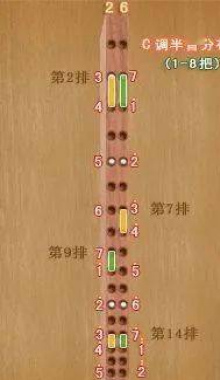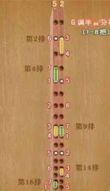 G大調半音位置的分布也是規律有序。在第一把位上,它和D大調不同是外弦上“3-4”音的位置(外弦的第2至第3排之間),而內弦“7.-1”半音的位置和D大調基本相同(在內弦的第4至第5排孔位間)。