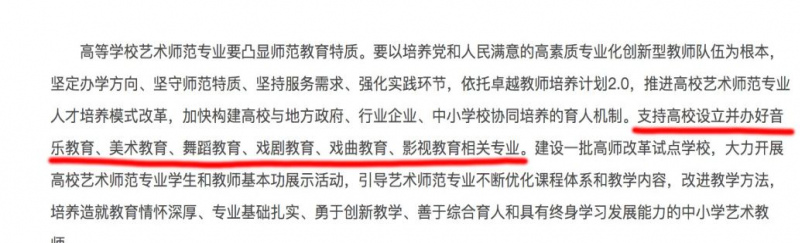 根據《意見》,藝術師範教育也是高校美育工作重點。支持高校設立並辦好音樂教育、美術教育、舞蹈教育、戲劇教育、戲曲教育、影視教育相關專業。建設一批高師改革試點學校,引導藝術師範專業不斷優化課程體系和教學內容,改進教學方法,為基礎教育培養高素質專業化創新性美育教師。