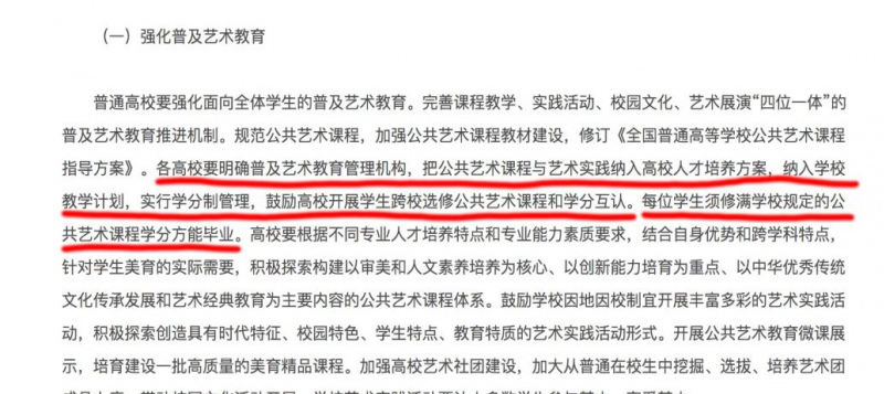 教育部體育衛生與藝術教育司負責人答記者問時表示:開設公共藝術課程和組織實施教學是高校普及藝術教育重要的推進機制之一。早在2006年,教育部辦公廳印發的《全國普通高等學校公共藝術課程指導方案》中就明確提出:每個學生在校學習期間,至少要在藝術限定性選修課程中選修1門並且通過考核。對於實行學分制的高等學校,每個學生至少要通過藝術限定性選修課程的學習取得2個學分;修滿規定學分的學生方可畢業。