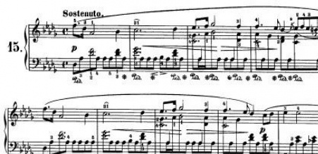 這首作品就是著名的肖邦“雨滴”前奏曲。樂曲的伴奏聲部生動地模仿了單調的雨滴聲響。