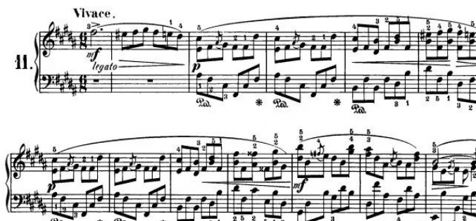 前奏曲第11首也是比較容易演奏的,音樂活潑流暢,宛如清澈的泉水,織體以左右手的琶音式的分解和弦為主。音樂聽起來輕松愉悅,緊促而又不失韻律。沒有複雜的節奏對位,而是“一對一”的6/8拍節奏。