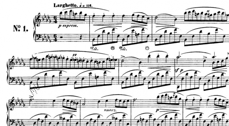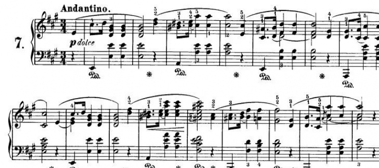 隨後,升sol奏出主題的第一個音符,旋律清晰明朗的出現在右手,仿佛是在回憶過去某件深有感觸的事情似的。中間部分有幾處華彩段,悲傷中透著輝煌,宛如湖中月亮的倒影,靈動透亮。這首作品演奏難度並不難,但是極其好聽,非常適合在音樂會上彈。
