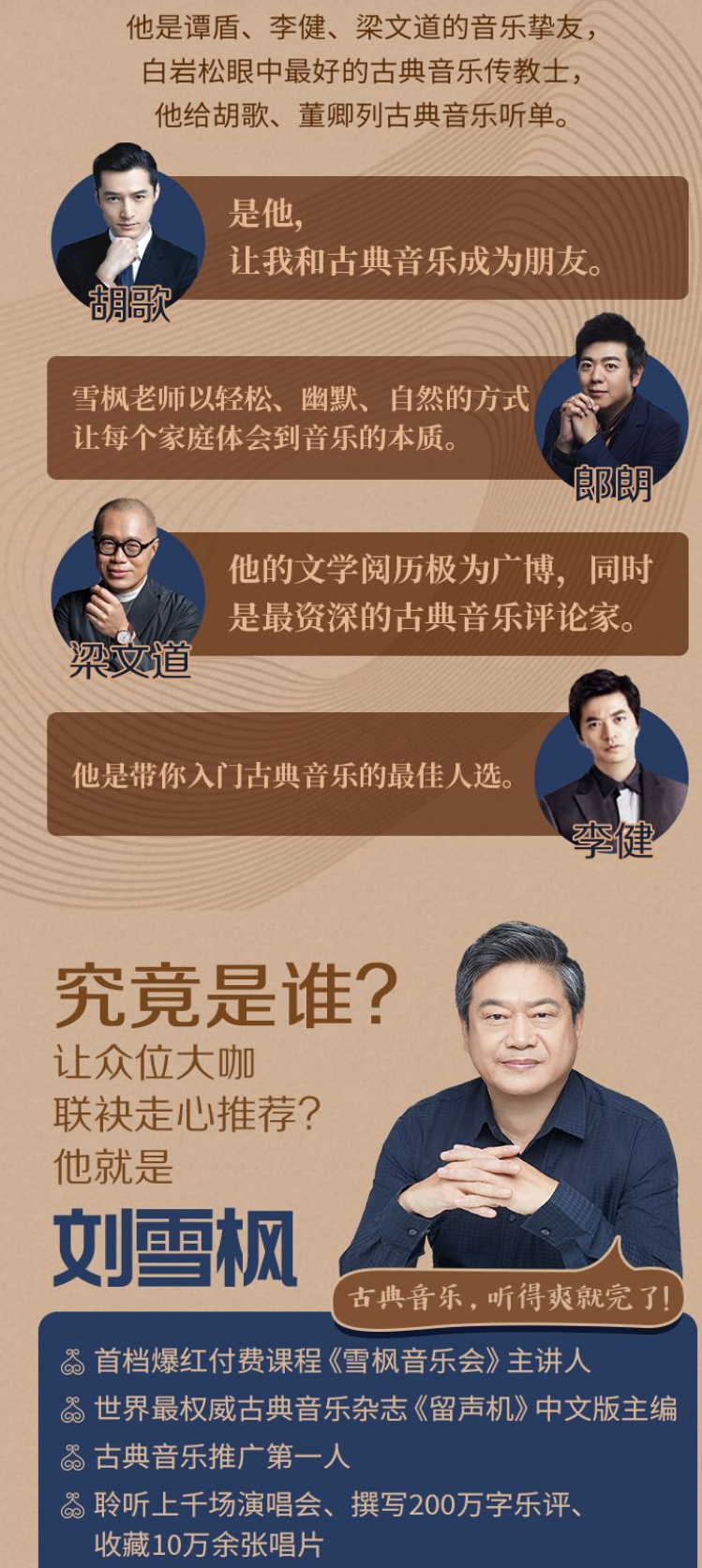 訂閱過劉雪楓專欄的演員胡歌說:“雪楓老師的古典音樂,每個普通人都能聽得懂。”