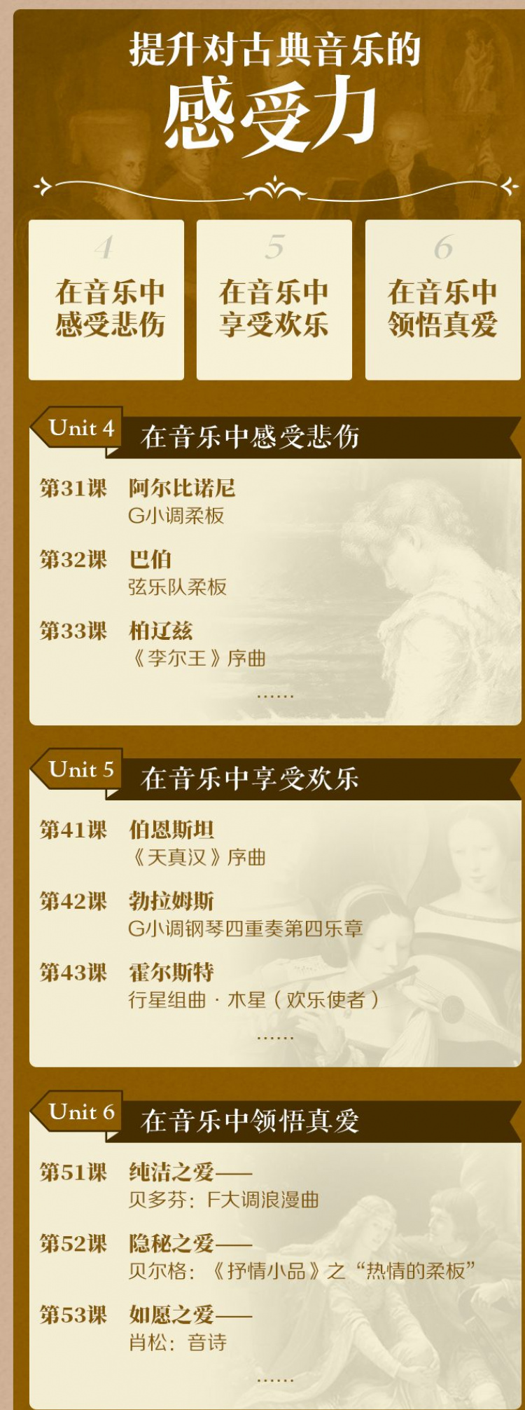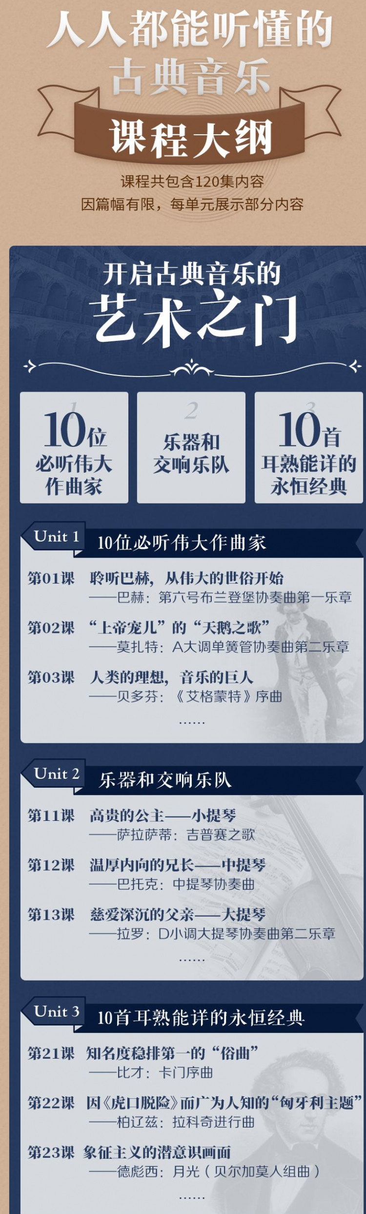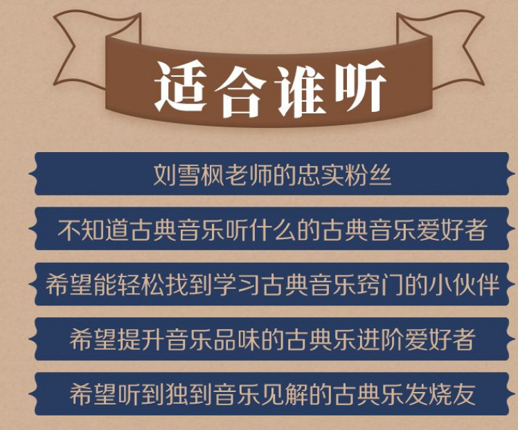 這門課程延續劉雪楓老師接地氣的古典音樂推廣理念,破除“聽音樂先要學音樂”的接受誤區,精心構架了120節課的精彩內容。