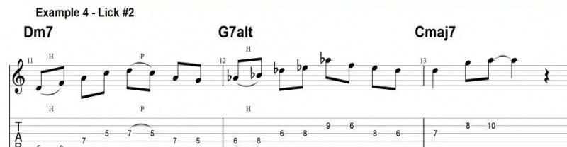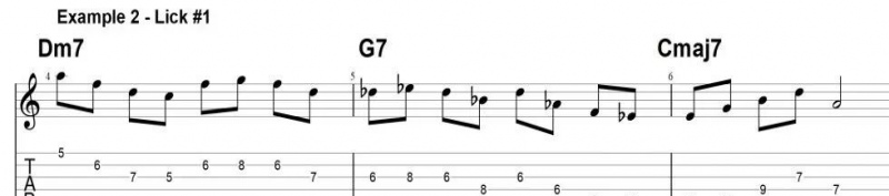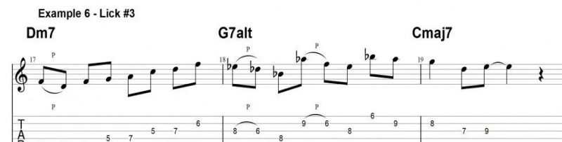 因此,在使用五聲音階之前,學會豐富即興的伴奏,是很重要的,比如以下這三個五聲音階樂句,它們的和聲背景都是有著很強可塑性和開闊性的七和弦,也是爵士樂裏常見的2-5-1和聲套路。