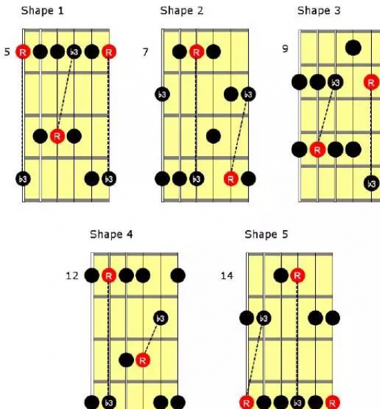 另外,不要逮到常用的五聲音階指型,就狂用不停,比如La指型和Mi指型之類的。不同的把位都能給你新鮮的靈感,五聲音階有五個指型,這意味著樂句的構建與設計,你可以有N*5個選擇!