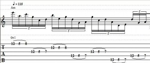 比如,你可以跨弦演奏某個五聲音階指型,讓它聽起來更有跳躍感: