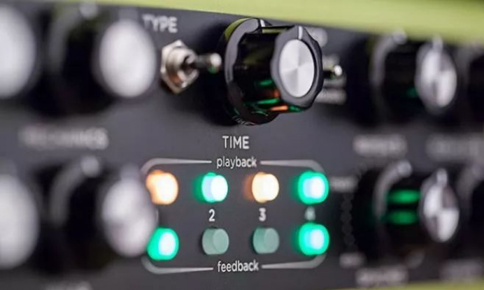 右側還有一些基本的控制功能:延時時間、速度、輸出水平等,還有一個獨立的彈簧混響線路。腳釘部分包括無限重複&振蕩、打拍定速、預設儲存/調出等功能,長按Tap腳釘激活“Sound On Sound”(SOS)樂句循環模式,該模式下可錄制loop樂句,可實現類似磁帶機的變速效果、機械式暫停、反向等操作。所有功能都支持MIDI控制。