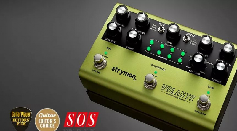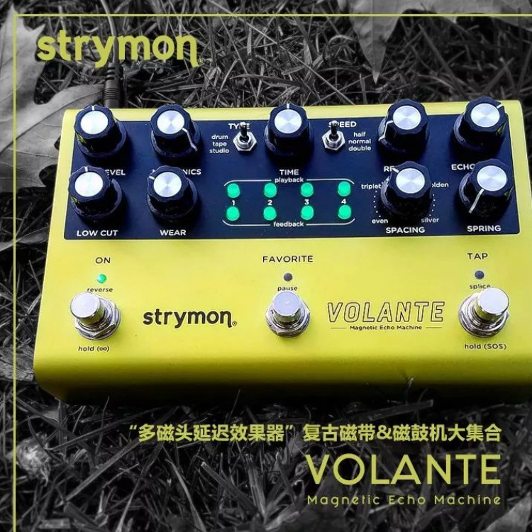 Strymon出過各種風味的回聲/延遲單塊:經典磁帶延遲(El Capistan)、盤式磁帶機延遲(Deco)、80年代雙軌數字延遲(DIG)、可玩性豐富的現代延遲(Timeline)等等,這次的Volante則把眼光轉向了6、70年代的磁鼓&磁帶回聲機,采用多磁頭設計,集合了磁鼓式延遲(drum)、商業磁帶機(tape)、錄音室盤式磁帶機(studio)三種音色,各項控制功能也都來源於當時頂尖的磁介質設備,讓用戶更真實的探索這些複古機器的魅力所在。