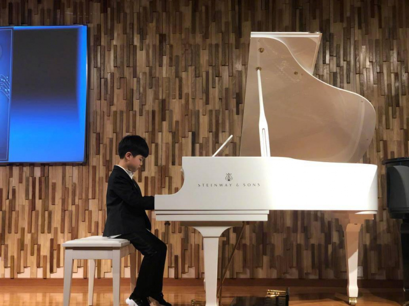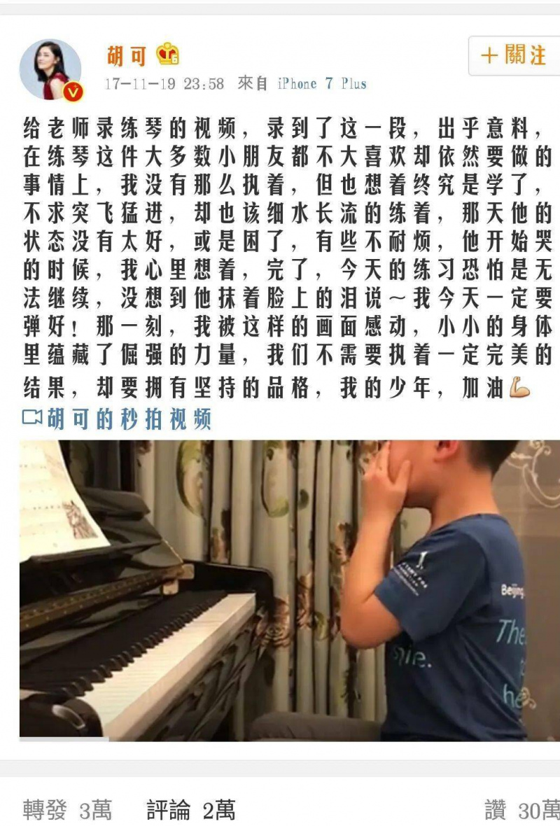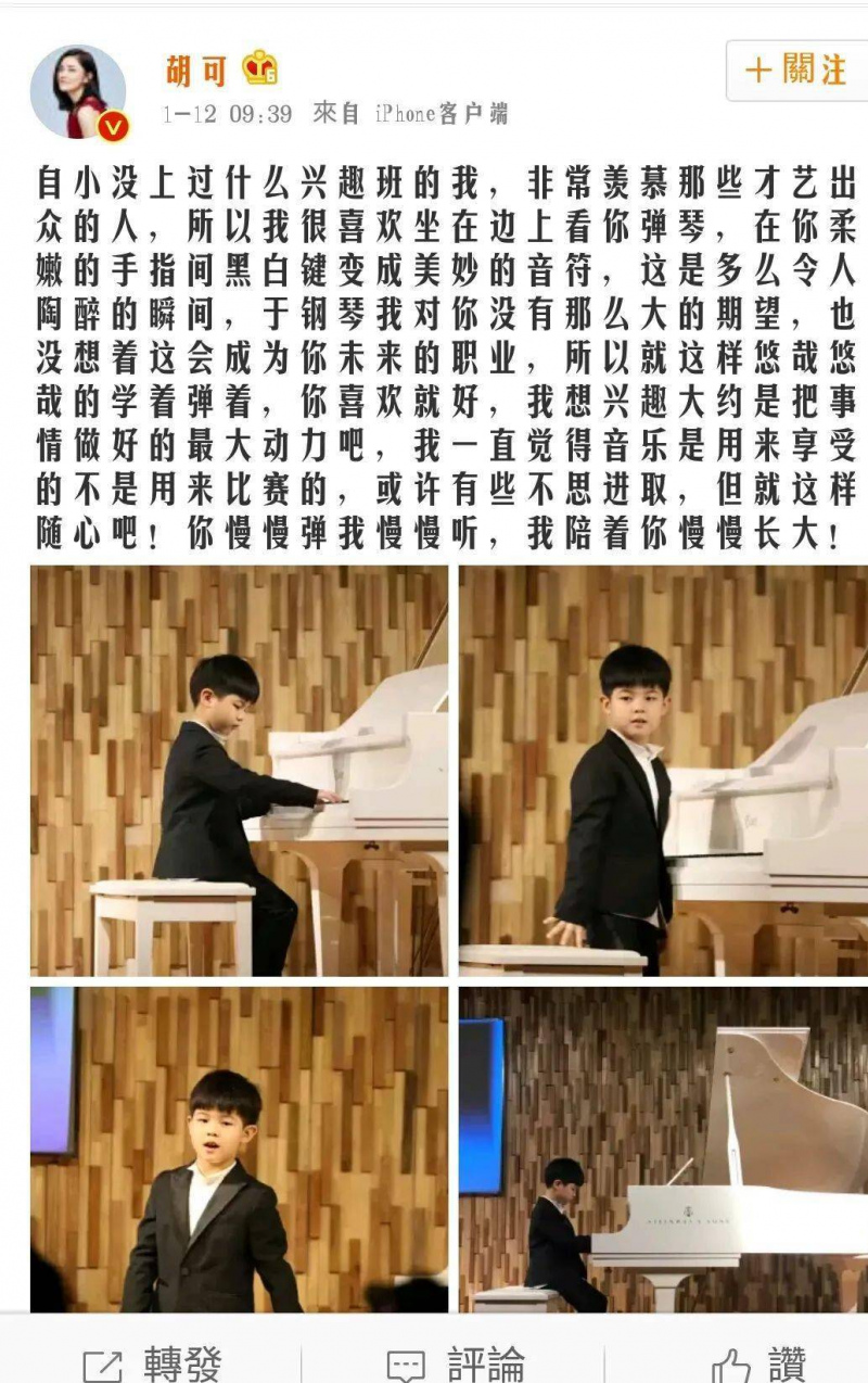 胡可也在微博發出一組安吉彈鋼琴的照片