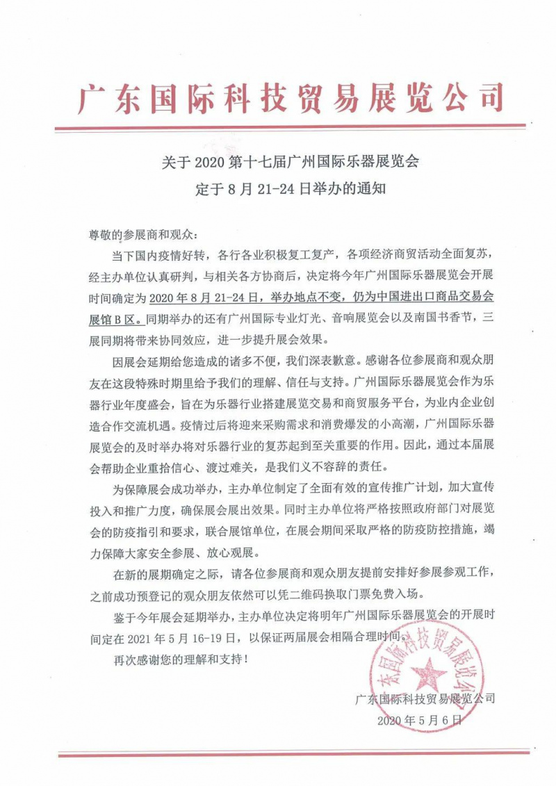 鑒於今年展會延期舉辦,主辦單位決定將明年廣州國際樂器展覽會的開展時間定在 2021年5月16-19日,以保證兩屆展會相隔合理時間。