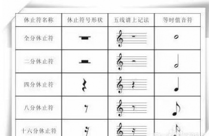 休止符表示不同長短音的間斷符號,根據不同的拍值表示如上圖所示。