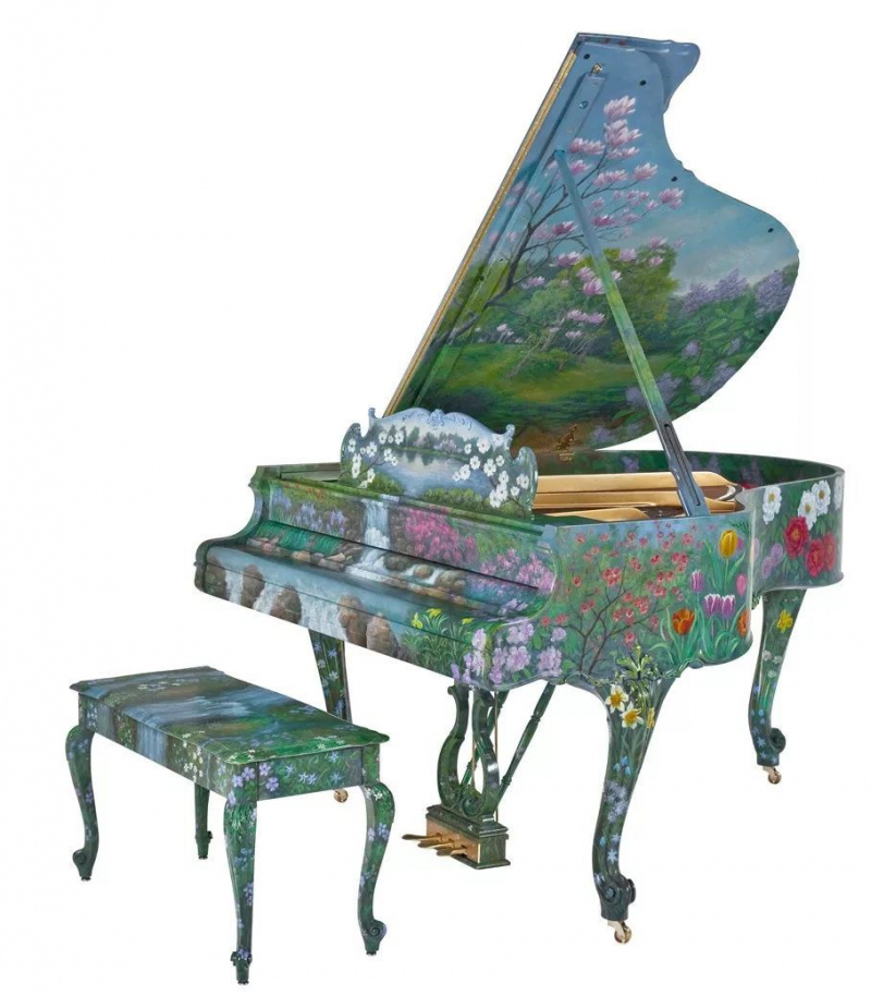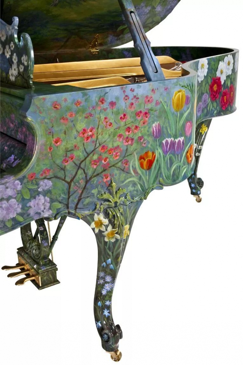 在路易十五風格的M型三角鋼琴上,繪有伊甸園般的夢幻春景:藍天白雲,清泉激流,繁花綠葉春天的生機、喜悅和靈秀,都精妙地融於華麗的琴身中。
