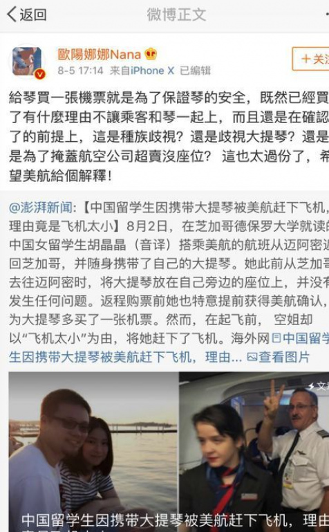 其實,歐陽娜娜從未放棄過自己喜愛的大提琴。看到別人因為大提琴坐飛機遇阻時,她也忍不住站出來感同身受地為受害者聲援。