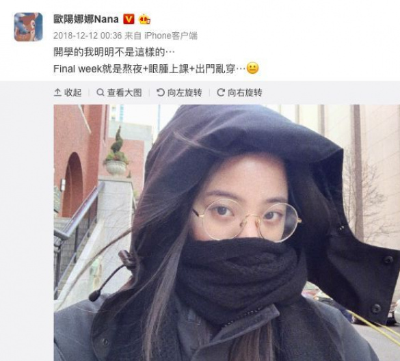 大家還記得歐陽娜娜剛開學的樣子吧,學期臨近結束時她分享了一張Final week後的自拍照,並配文稱Final week就是熬夜+眼腫上課+出門亂穿。