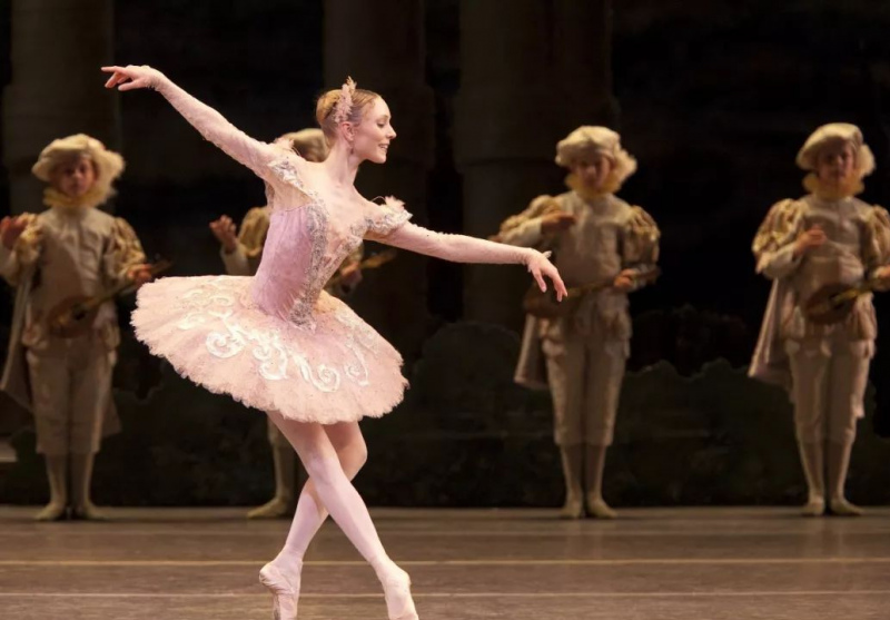 玫瑰柔板是奧羅拉公主與四國王子共舞的著名舞段,極其考驗女舞者的控制與平衡。一大看點就是公主在單腳尖站立的情況下把保持平衡的右手舉上去並依次交給4位王子,能做到又穩又美的程度真的超難!
