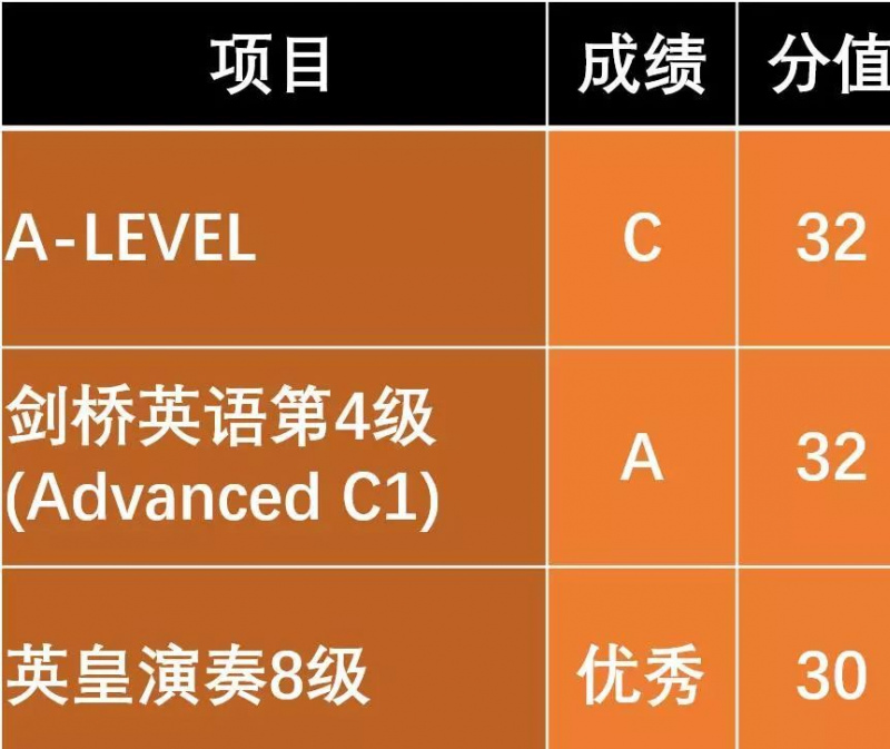 英皇考級的加分分值處於什麼水平?類比一些大家相對熟悉的UCAS加分項目更容易理解。英國主流高中課程A-LEVEL考取C級成績(60-70分),劍橋英語第4級考取A級成績(約相當於雅思8分水平)對應分值均為32,與英皇演奏8級優秀的30分相當。