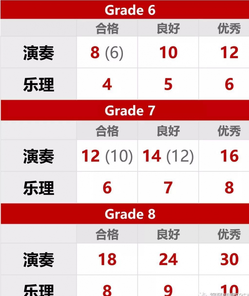 解答:英皇樂理和演奏6-8級考試獲得優秀、良好、合格三檔成績都可兌換相應的Tariff積分。兌換分值每過一段時期調整一次。最新2017-2018年英皇考級成績對應的分值如下表,像樂理6級合格可兌換最低的4分,而如果以優秀通過演奏8級可兌換取最多的30分。