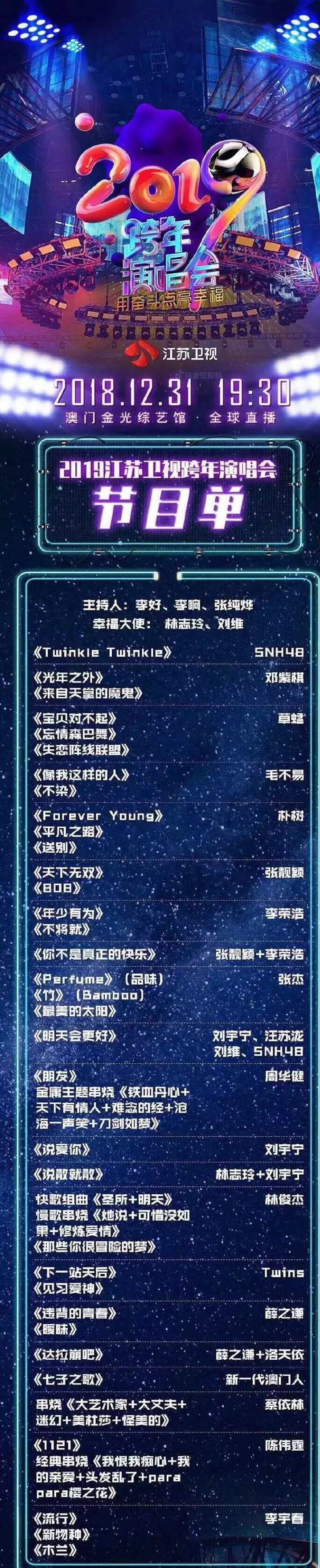 江蘇衛視跨年節目單江蘇衛視跨年演唱會節目單,李宇春再次壓軸演繹新歌;張傑首次加盟江蘇,連唱3首歌;林志玲和劉宇寧合唱《說散就散》;薛之謙和洛天依跨次元表演;Twins合體,阿嬌婚後首秀;還有陳偉霆、林俊傑、蔡依林、鄧紫琪、毛不易、張靚穎、李榮浩、汪蘇瀧、周華健等實力唱將,可以說聽歌就看江蘇衛視跨年准沒錯兒!