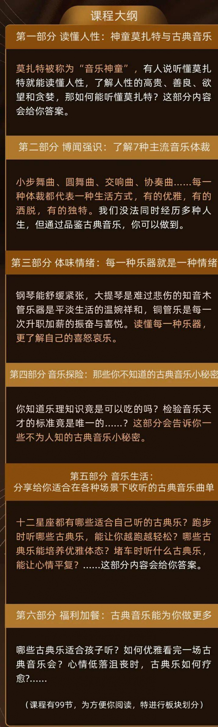 99節課包含了音樂大師故事,古典音樂品鑒方式,基礎音樂理論,全方位讀懂古典音樂,讓你不再犯愁“怎麼聽”;