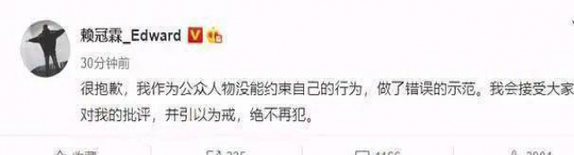 賴冠霖的反應速度還是挺快的,在網上曝光他當街抽煙以及吐痰的事情,沒多久,本人就親自出來道歉了。這也是又一個,因違反了社會公德,而向公眾道歉的明星。