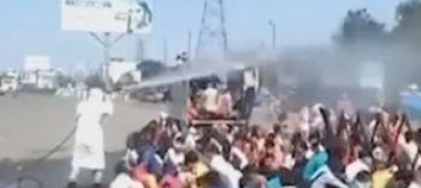 印度各地封城後,消毒方法也很特別,核准進城的人員集中蹲下,接受消毒水槍一番噴灑後,才能回家。