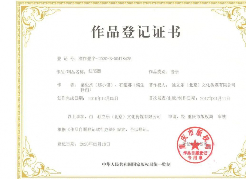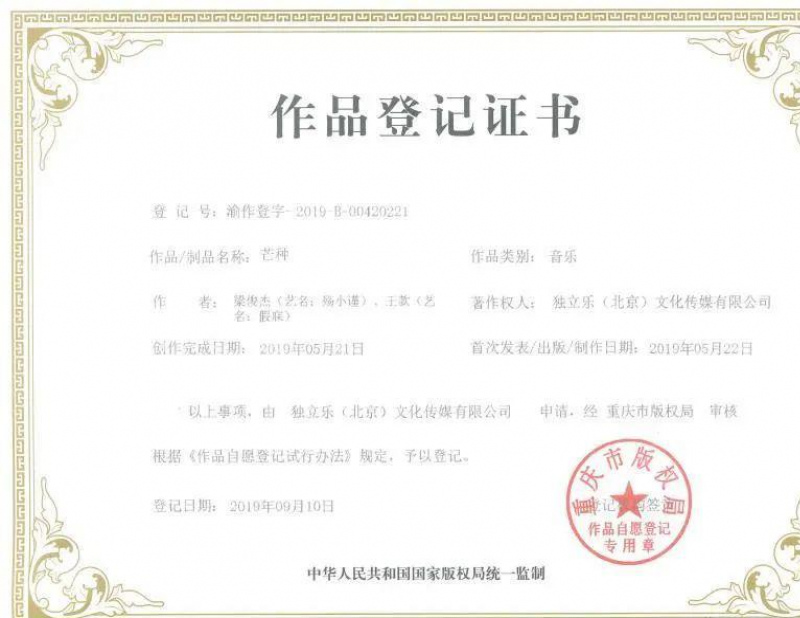 “音闕詩聽”還曬出了《芒種》和《紅昭願》的作品登記證書。