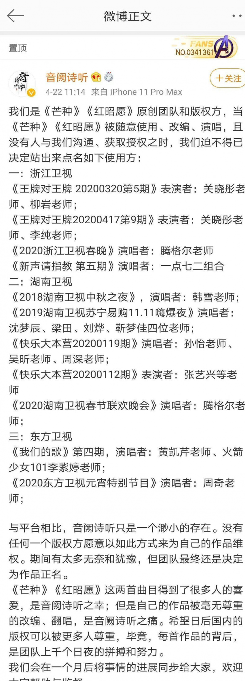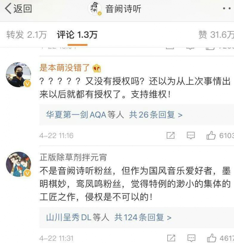 但是4月22日, 《紅昭願》、《芒種》的原創團隊及版權方@音闕詩聽 發微博維權,稱歌曲被多檔節目改編、演唱未經過自己同意和授權,列出了節目名單和作品登記證書,並稱,“希望日後國內的版權可以被更多人尊重,畢竟每首作品的背後,是團隊上千個日夜的拼搏和努力。”