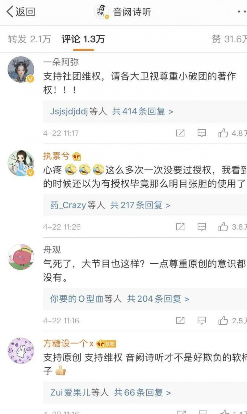 音闕詩聽發出微博之後,得到了部分網友的留言支持