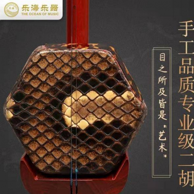 星海二胡特選黑檀木,厚實穩重,莊重華貴,透射出濃厚的現代氣息,音色亮而不燥,柔而不矯,反應機敏,表現力強。特選緬甸金花蟒背皮,張力均勻,發音明亮。