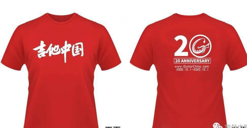 只要您留言,本文下, 截至2020年10月7日上午11點,點贊最多的10個留言用戶,每人將獲得一件 吉他中國20周年官方紀念TEE ,效果圖如下(以實物為准)