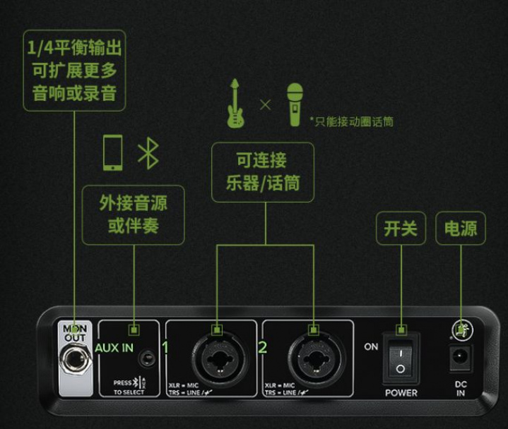 FreePlay Live具有靈活性,可以連接麥克風、吉他、鍵盤、或播放設備,體積小方便攜帶的特性為戶外彈唱帶來了極大的便捷性。