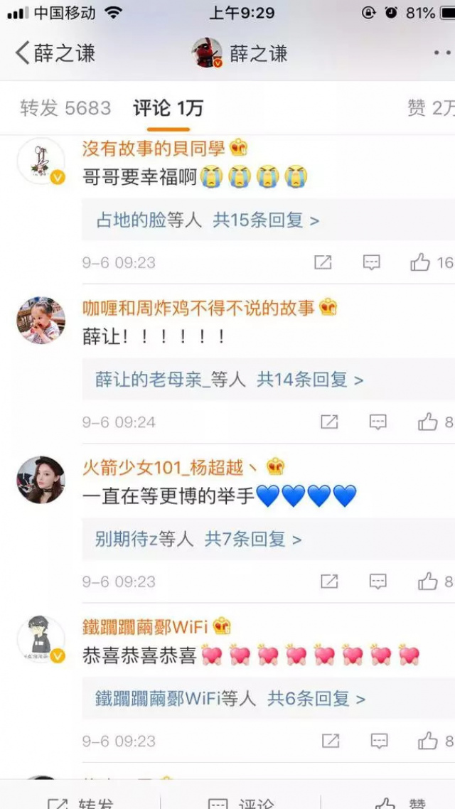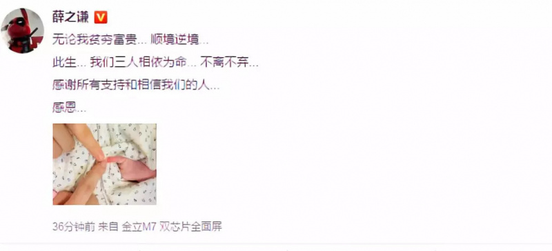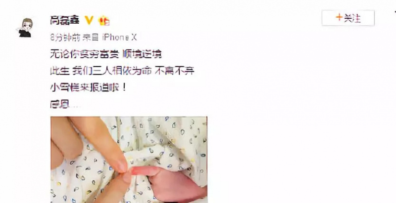 9月6日,薛之謙在微博曬出一家三口手指照宣布當爸:“無論我貧窮富貴,順境逆境。此生,我們三人相依為命,不離不棄。”並感謝所有支持和相信自己的人。隨後@高磊鑫。