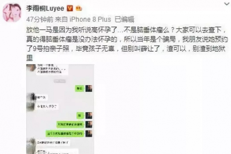 早前,李雨桐突然發布微博稱要放過薛之謙一馬,因為她聽說薛之謙的妻子懷孕了。還預約了在9月份拍攝親子照的事情,所以,看在孩子的份上李雨桐大度的想要放過薛之謙了。