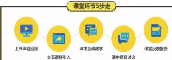 正式上課前教師會回顧上節課的關鍵知識點,之後還會用故事或遊戲的方式引入本節課的內容,5步教學讓每節課都豐富有趣。