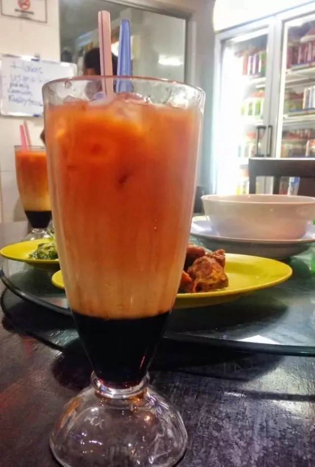 特色飲品是三色茶,從下至上是楓糖漿,椰奶和茶,喝之前需要把三層混合打勻。