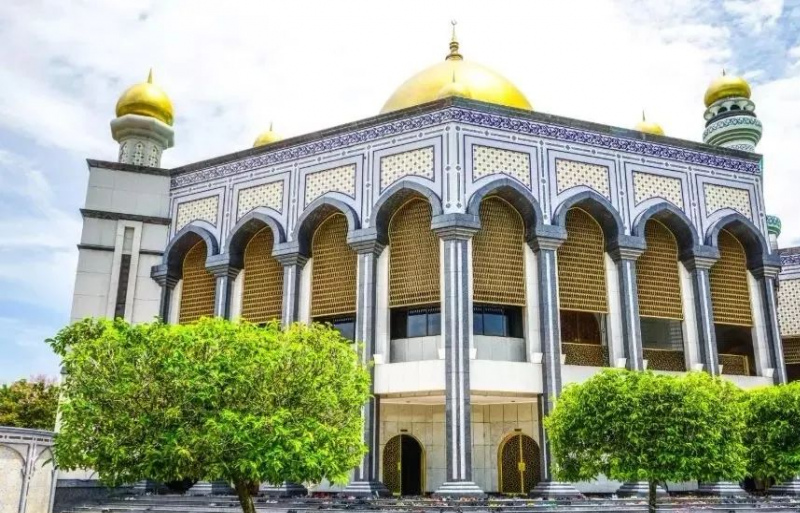 全亞洲最大的清真寺,由國王蘇丹哈桑納爾·博爾基亞個人捐資修建。一共有29個(象征現在是文萊歷史上第29個蘇丹統治的王朝)圓頂,除了祈禱室的圓頂刻著古蘭經的經文,沒有鍍金。其他28個圓頂都是純金打造。建造整個寺院耗金2.4噸。裏面的設施全部電子化,水龍頭是自動感應式的。