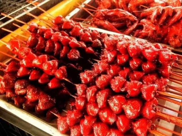 最有特色的食物是烤雞屁股把五六個雞屁股刷上油和蜜糖,再用大火烘烤,一口咬下去很有嚼勁,調料也很好地掩蓋了雞屁股原有的氣味,只剩下了肉香。