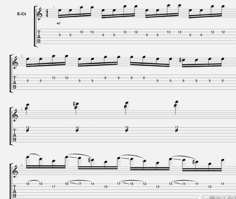 在開頭的前四小節中,我使用了E旋律小調-以Joe Stump風格的Double-picking開始,Yngwie風格的樂句結束。