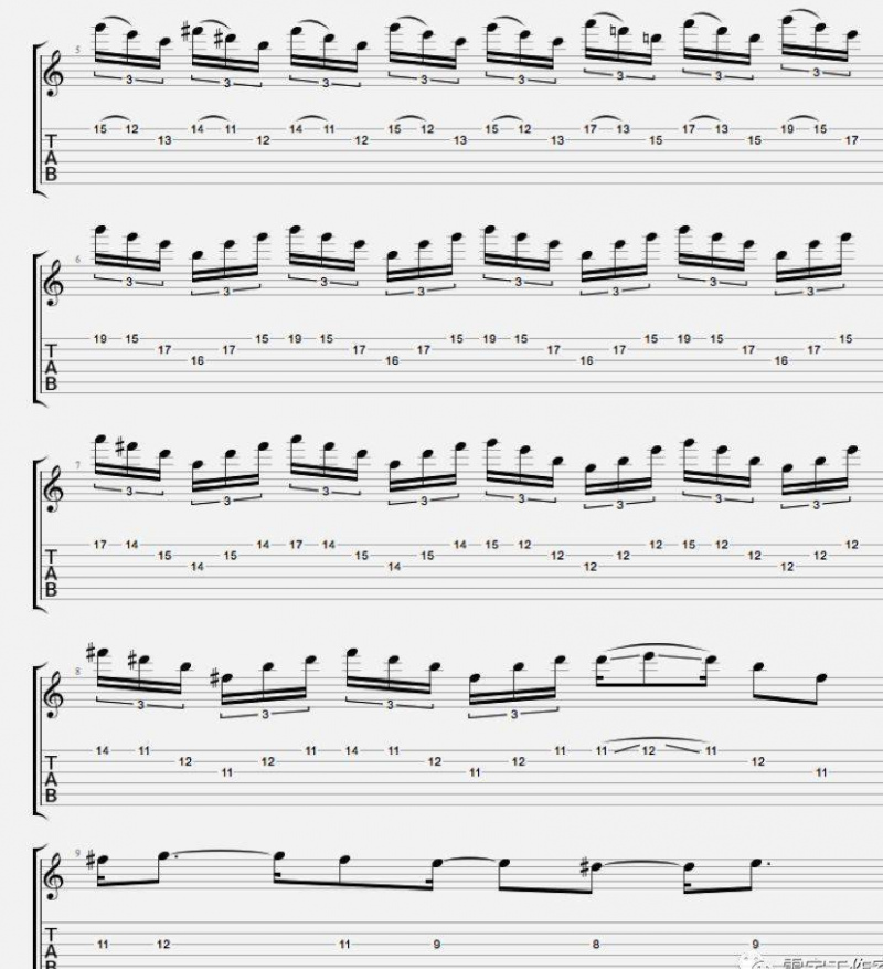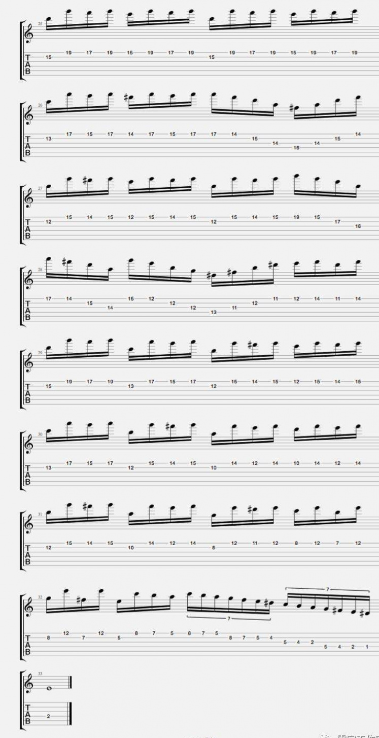 這段solo裏出現了E小調音階,旋律小調音階,E布魯斯音階,E多利亞音階。