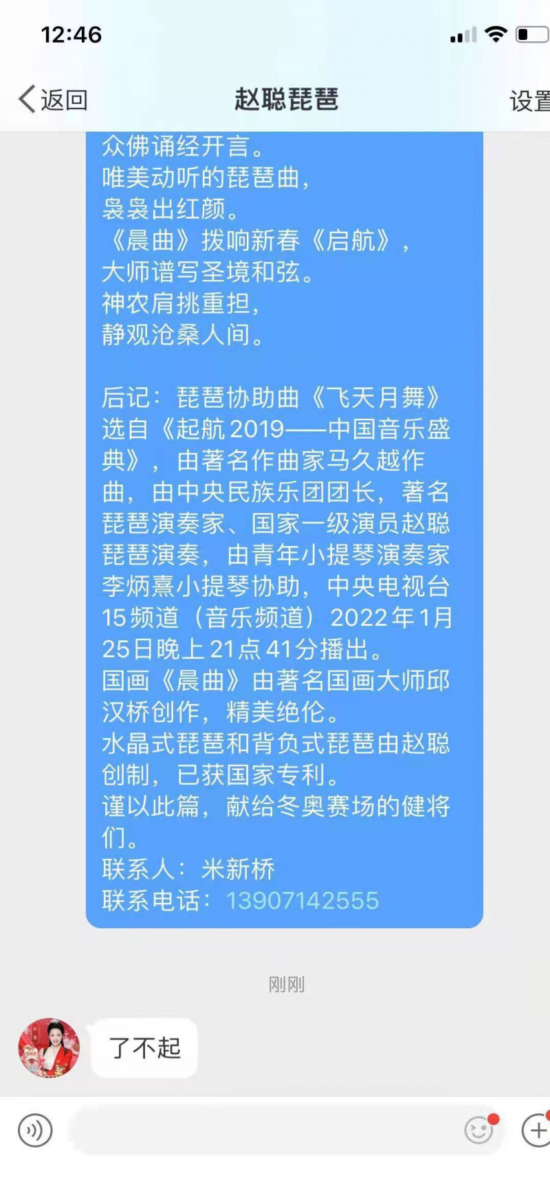 後記:琵琶協助曲《飛天月舞》選自《起航2019——中國音樂盛典》,由著名作曲家馬久越作曲,由中央民族樂團團長,著名琵琶演奏家、國家一級演員趙聰琵琶演奏,由青年小提琴演奏家李炳熹小提琴協助,中央電視台15頻道(音樂頻道)2022年2月8日晚上22點14分播出。