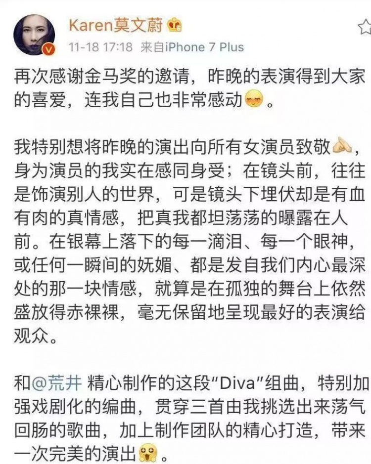 同時作為演員的她,也通過昨晚的演出向所有女演員致敬。
