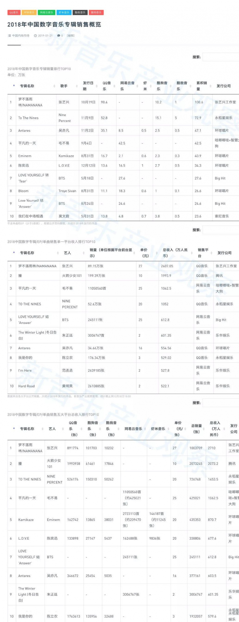 在2018中國數字音樂專輯銷售榜單中,張藝興的《夢不落雨林》取得了多個第一,火箭少女101,毛不易,NINEPERCENT,朱正廷,陳奕迅,陳立農等藝人的作品也在榜單前列。