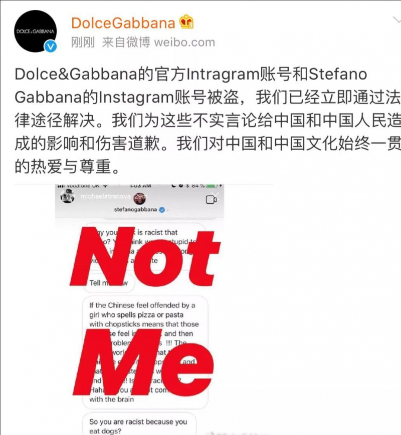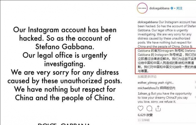 事情到了這個地步D&G終於 通過官方ins和官方微博作出道歉,稱其官方賬號和設計師賬號均被盜,為這些不實言論給中國和中國人民造成的影響和傷害道歉,並強調對中國和中國文化始終保持熱愛與尊重。