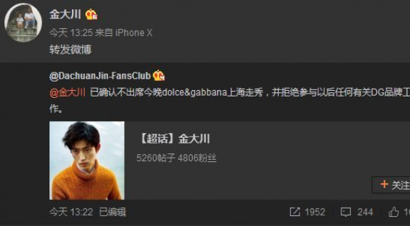 模特金大川確認不出席今晚走秀,並拒絕參與以後所有DG的工作。