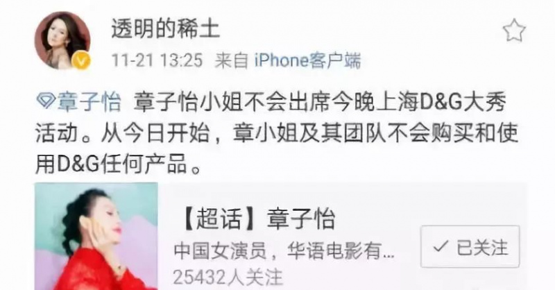 章子怡工作室也發出聲明表示再也不會購買和使用DG任何產品。