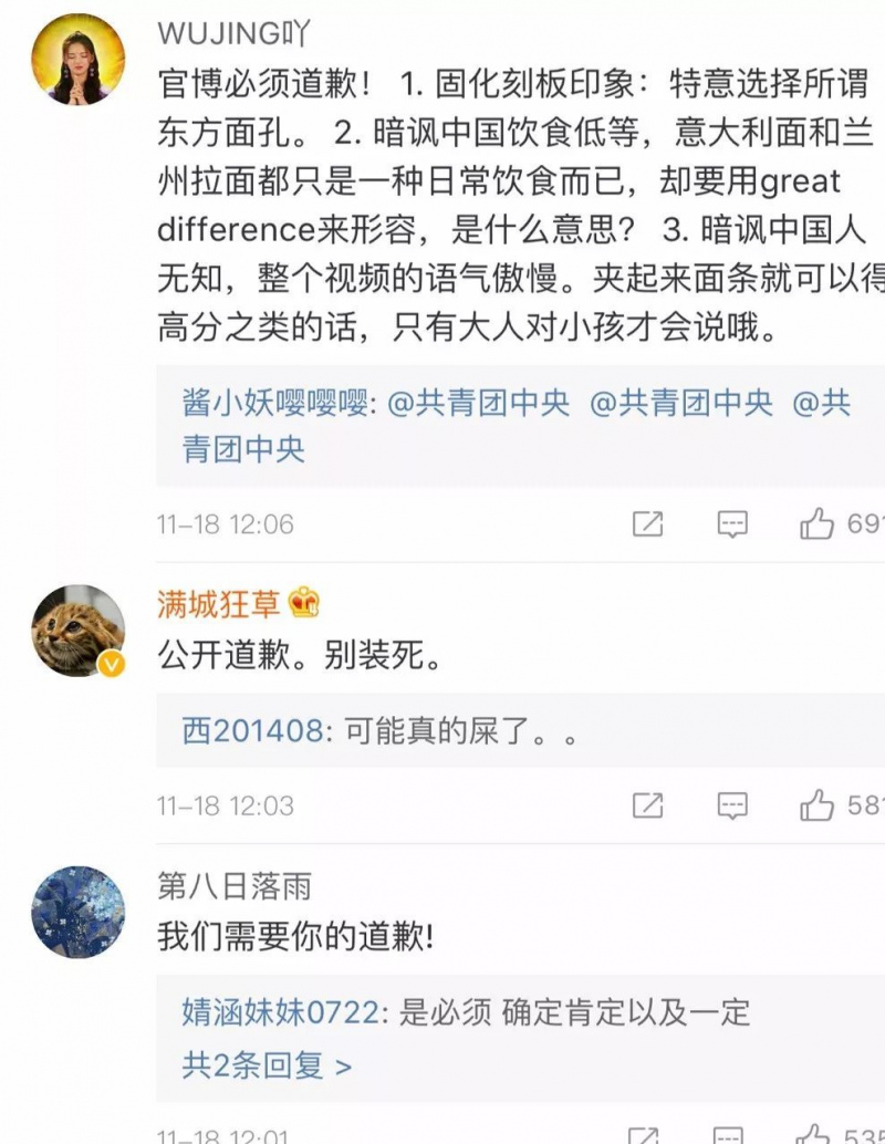 這組低能中文配音美食節目小品一發上來,輿論爭議全盤爆發,最後直接“罵”到DG微博刪視頻。