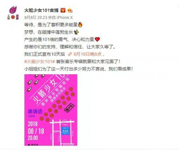 昨天火箭少女官博才宣布首張專輯發布,並確定8月18日進行媒體見面會。